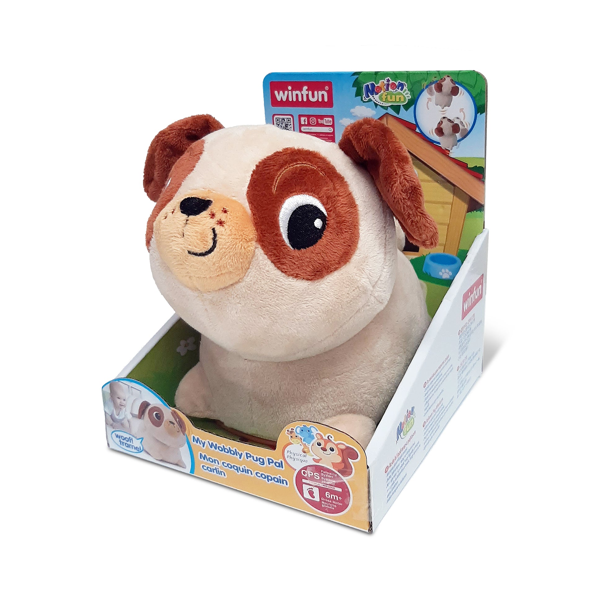 • Press the button to watch the pug move, encouraging baby to follow along for active play
