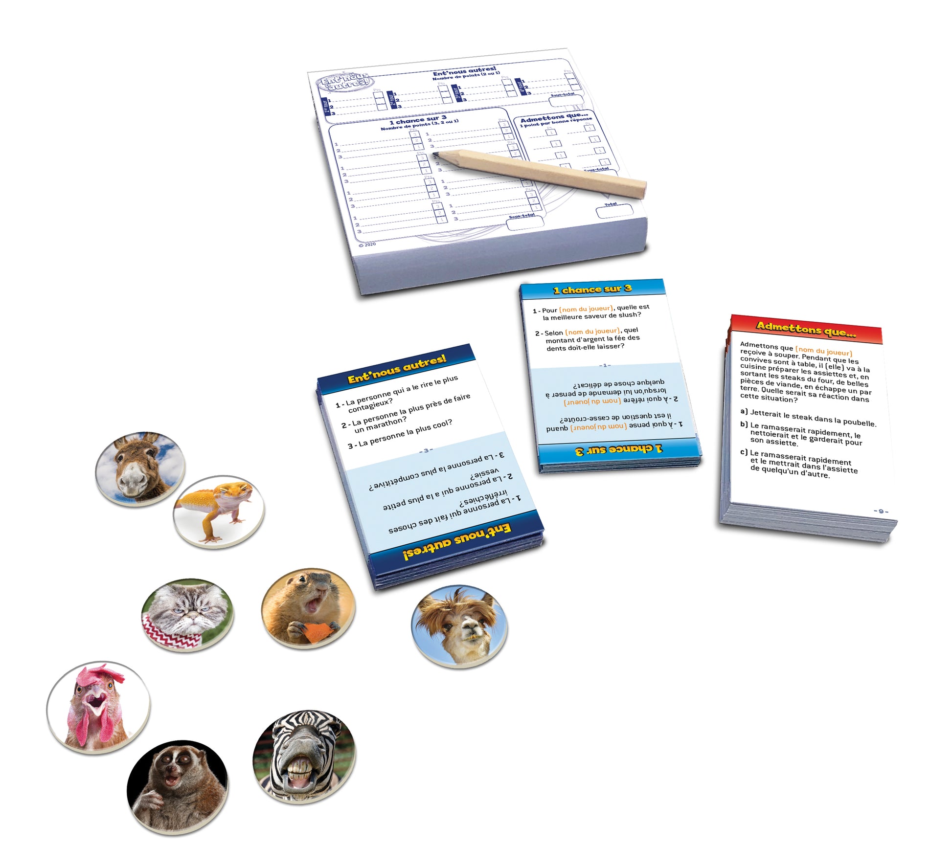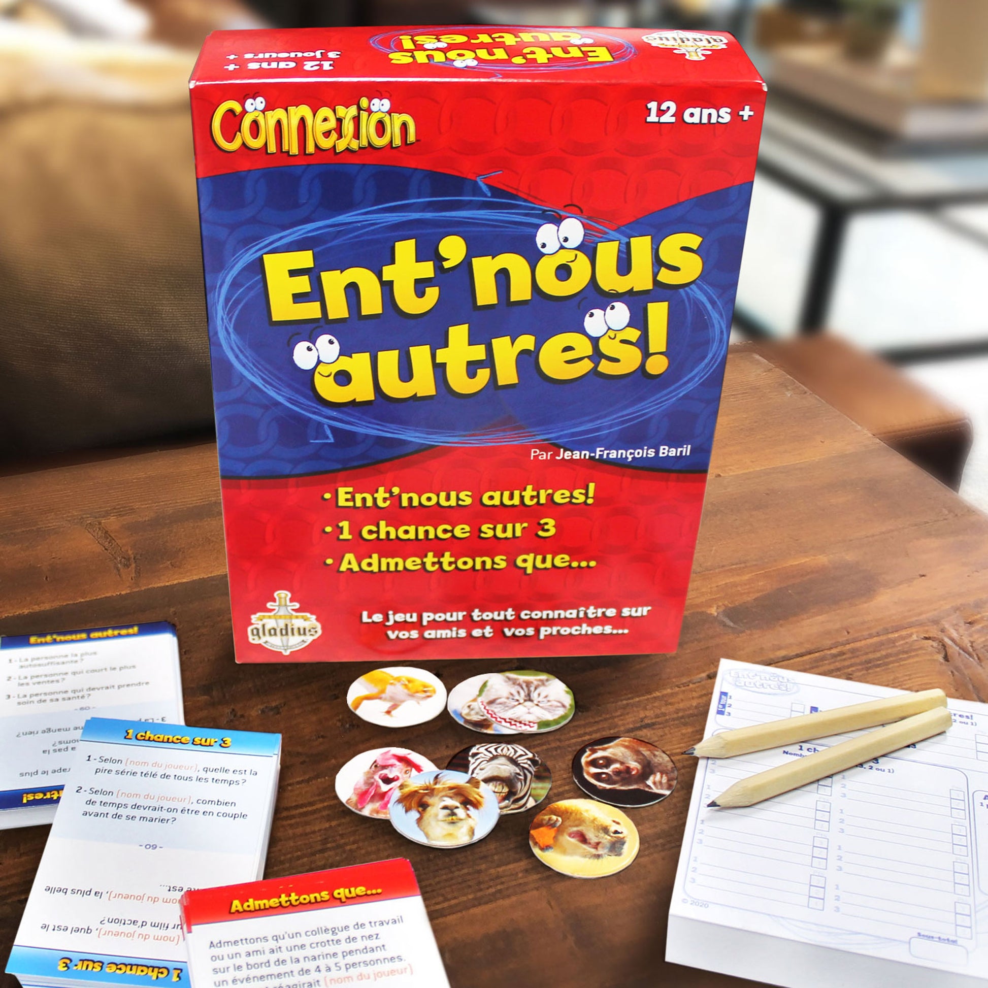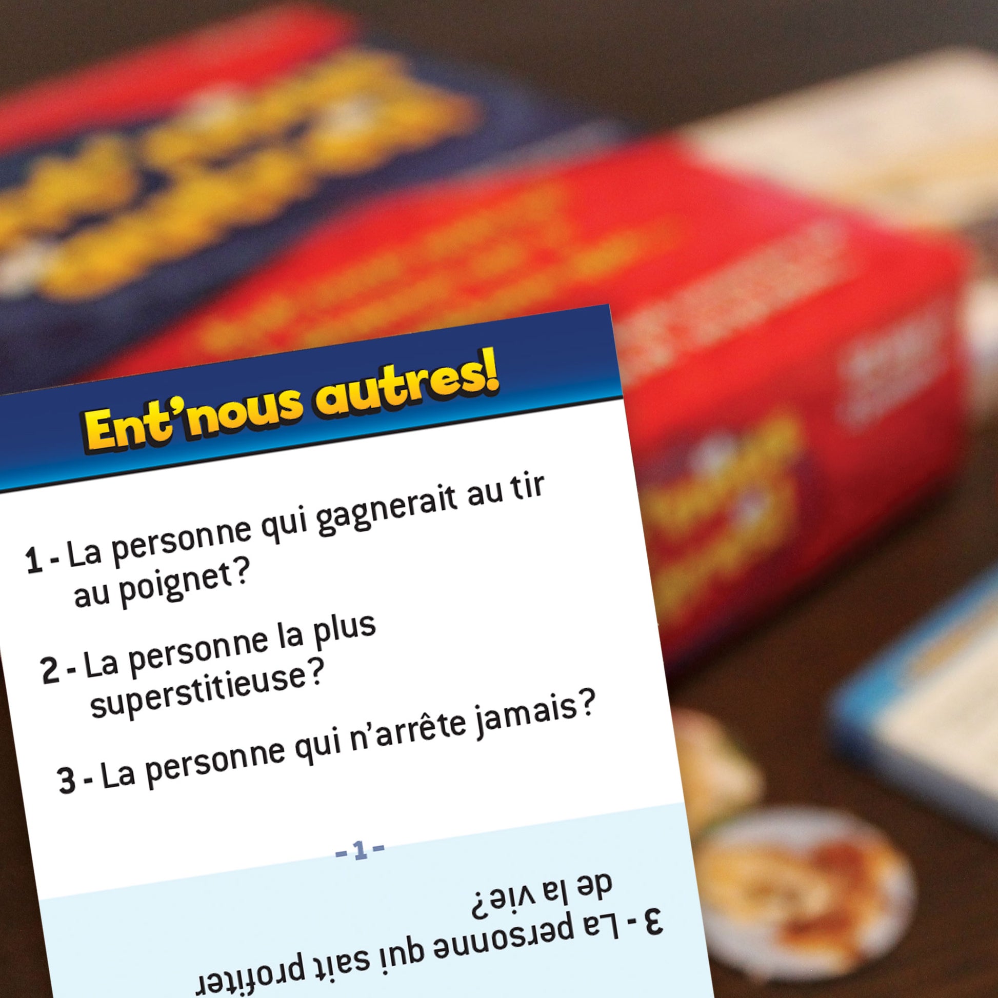 Ent’nous autres! est un jeu qui teste la complicité qui règne au sein d’un groupe de joueurs. À travers les 3 jeux proposés, les joueurs qui auront la meilleure connaissance des autres marqueront plus de points et remporteront la partie. Le jeu idéal pour susciter des rires, des discussions et, surtout, des confidences étonnantes!