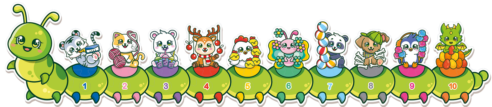 Ce casse-tête de Kikki la chenille Kioukis t’aidera à apprendre à compter et à reconnaître les chiffres de 1 à 10. Il suffit d’associer le chiffre de couleur avec le bon nombre d’objets qui entourent les amis Kioukis.