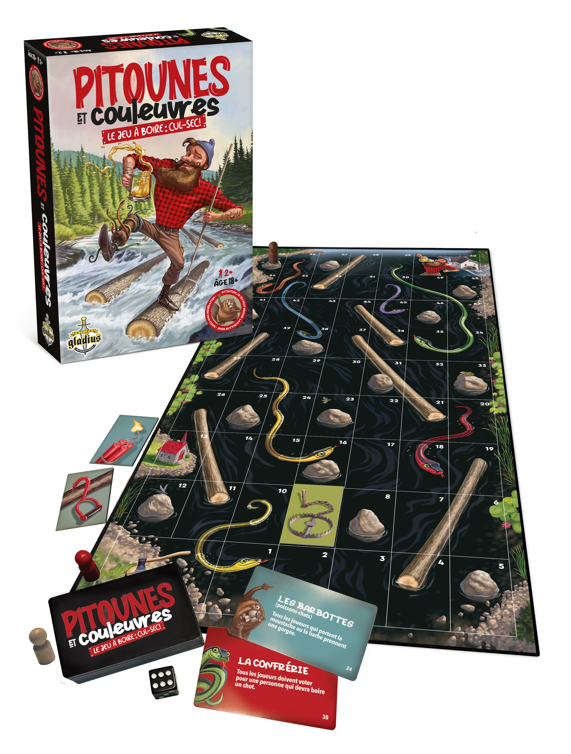 Plongez dans l'aventure avec ce jeu à saveur historique, remontez la rivière, surmontez les embûches, rendez-vous au moulin et « calez » votre verre pour remporter la partie, mais surtout évitez la gorgée de trop!