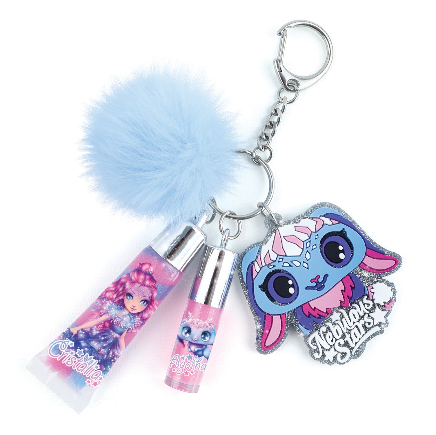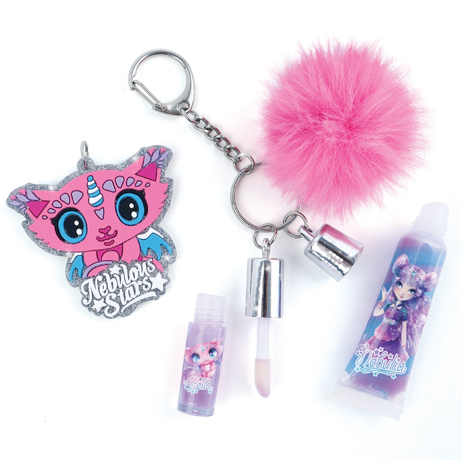Voici le porte-clés de tes rêves! Cet ensemble inclut deux tubes de brillants à lèvres parfumés, une jolie breloque et un pompon tout doux… Parfait pour des lèvres étincelantes en toute occasion!